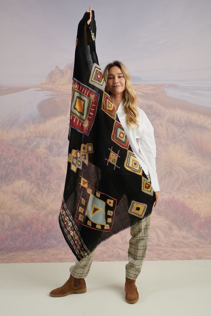 Confectionné avec soin, notre foulard en laine se distingue par ses broderies faites à la main, apportant une note d'élégance à votre style.Dimensions : 80 x 190 cm Composition : 100% laine avec broderies Conseil d'entretien : Nettoyage à sec