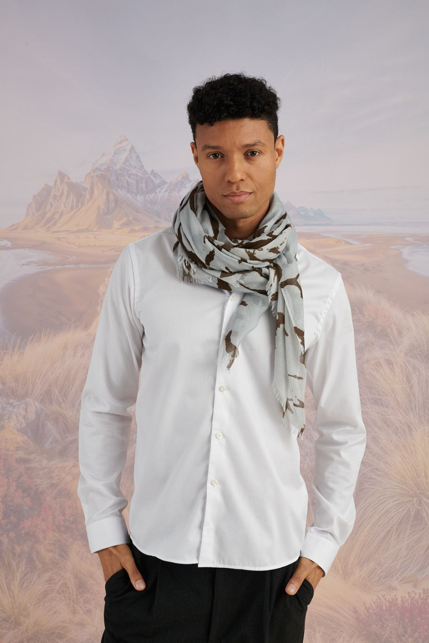 Enjoy modern comfort with our modal and wool scarf, measuring 100 x 200 cm. The soft modal combined with the warmth of wool creates an elegant and versatile accessory, ideal for adding a contemporary touch to your outfit.Dimensions: 100 x 200 cm Composition: 80% modal / 20% wool Care instructions: Dry clean
