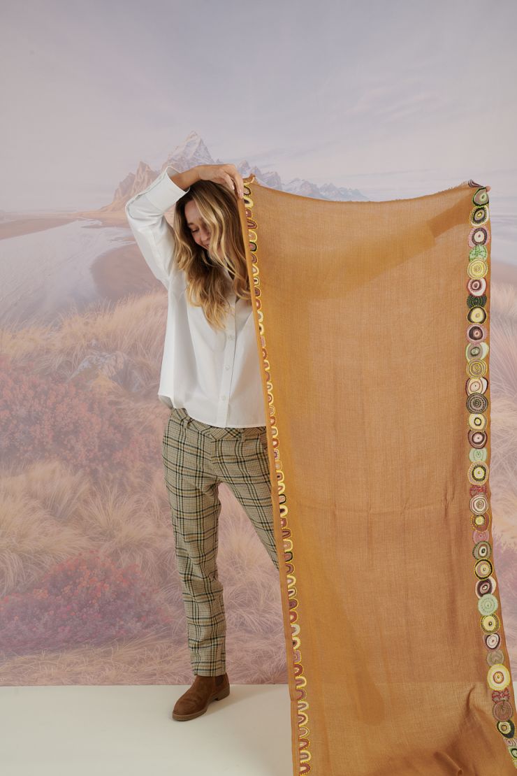 Confectionné avec soin, notre foulard en laine se distingue par ses broderies faites à la main, apportant une note d'élégance à votre style. Dimensions : 80 x 190 cm Composition : 100% laine avec broderies Conseil d'entretien : Nettoyage à sec