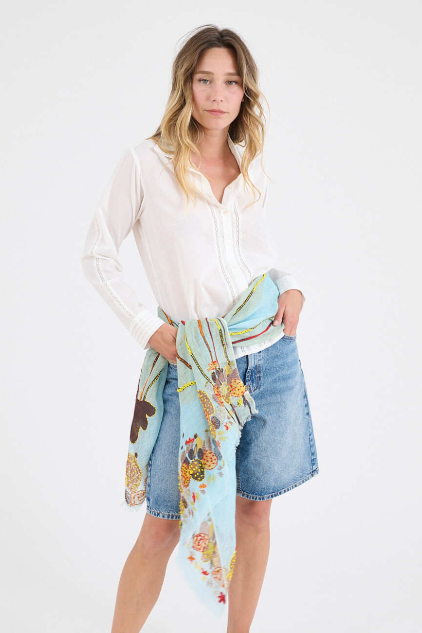 Confeccionada con esmero, nuestra bufanda de lino destaca por sus bordados hechos a mano, aportando un toque de elegancia a tu estilo.